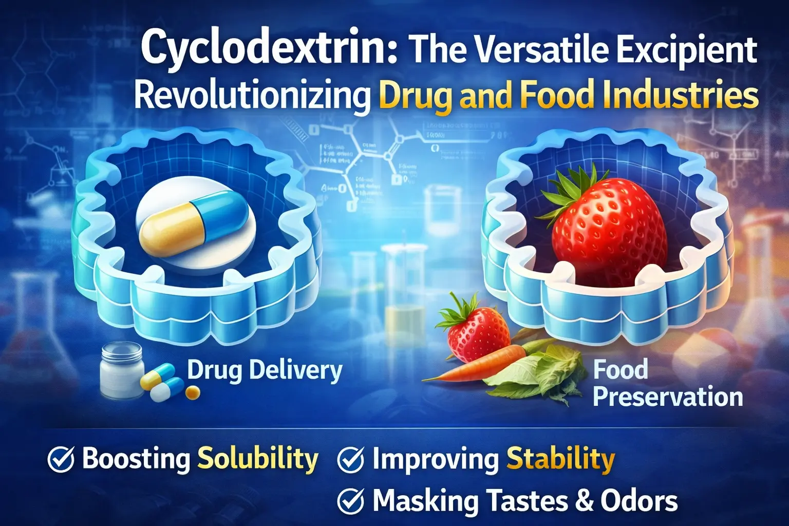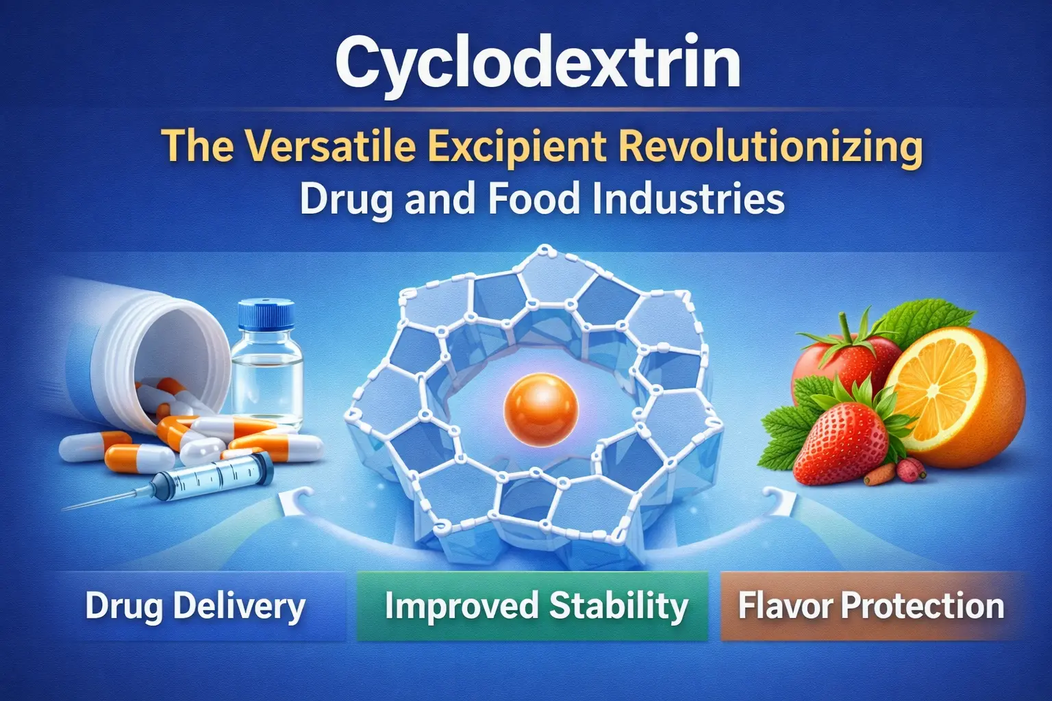 The discovery of cyclodextrin is one of the most important steps forward in the history of food and medicine. This naturally occurring cyclic oligosaccharide has changed the way we deliver drugs, keep food fresh, and use a lot of other chemicals in industry. The pruduct makes inclusion complexes that address important problems in many fields thanks to its distinctive molecular structure, which has a hydrophobic inner cavity and a hydrophilic exterior surface. This flexible excipient is changing formulation science and manufacturing processes all over the world. It can do everything from improving drug absorption to hiding bad tastes in medicines.