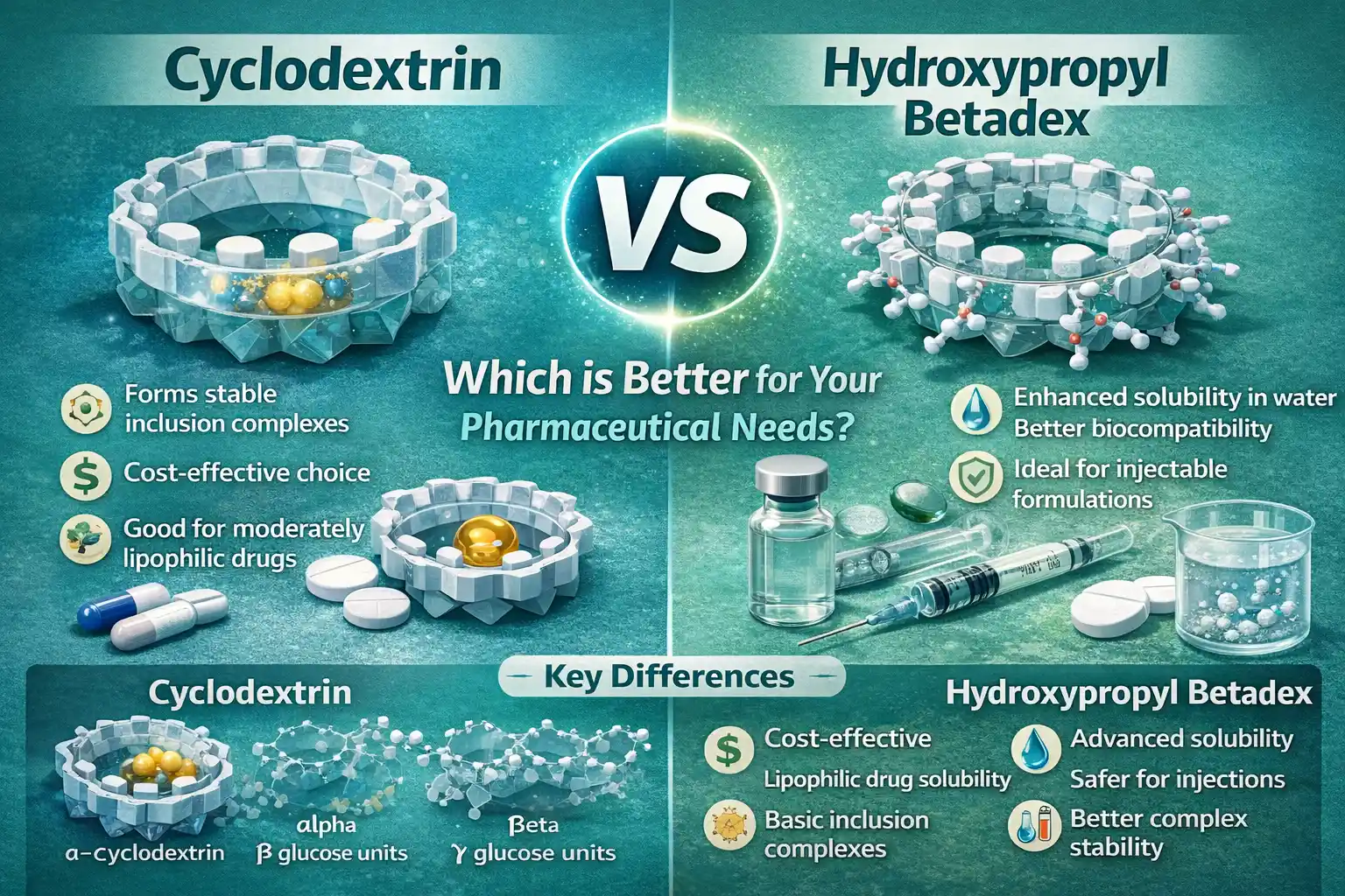 When it comes to pharmaceutical uses, cyclodextrin and hydroxypropyl betadex are both good for drug delivery methods in their own ways. Standard cyclodextrins are good at enclosing molecules and are cost-effective. On the other hand, hydroxypropyl betadex is better at dissolving in water and is more biocompatible. The choice depends on the needs of your formulation, with hydroxypropyl betadex providing advanced solubility improvement for difficult drug molecules and cyclodextrins excelling in basic inclusion complexes.