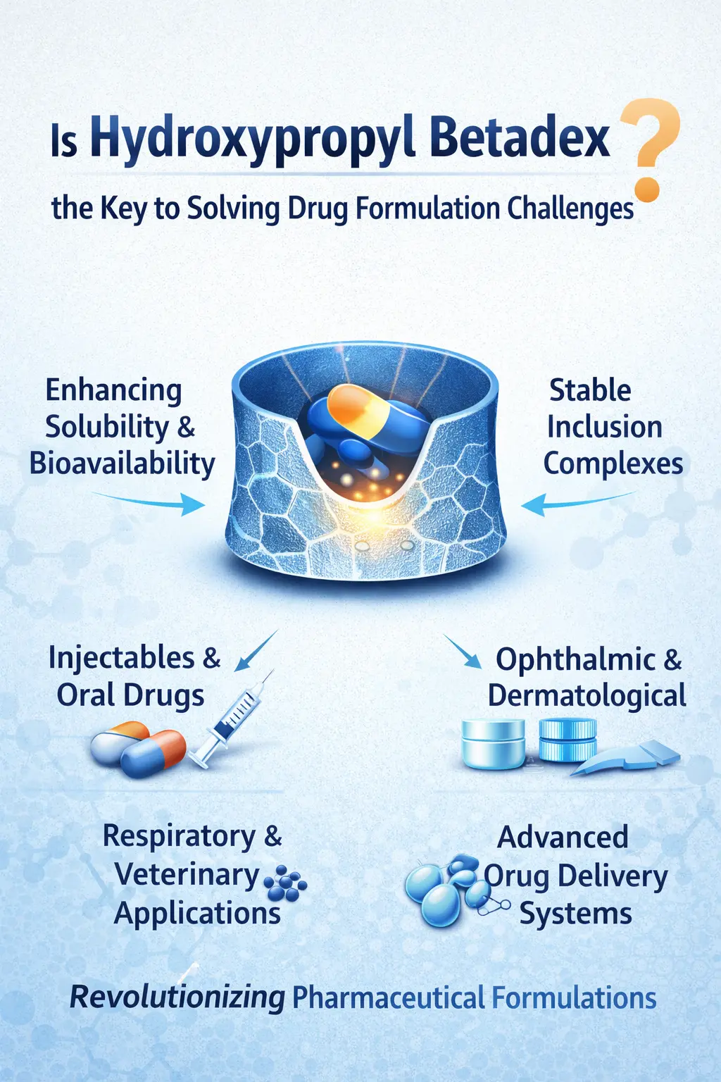 Hydroxypropyl Betadex is a big step forward in the technology of cyclodextrin derivatives. This hydrophilic polymer works by encasing molecules and forming stable inclusion complexes with drug molecules that don't like water. Compared to native β-cyclodextrin, the hydroxypropyl replacement makes it more soluble in water, which makes it very useful for medicinal uses.